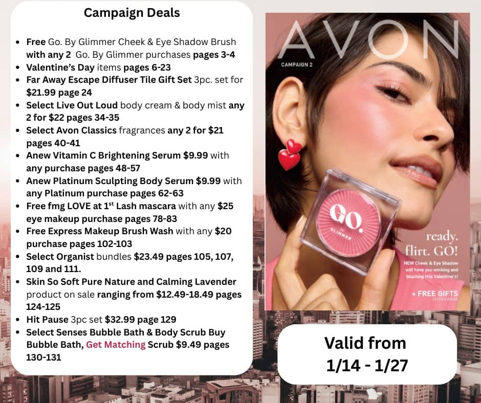 Shop My Online AVON Store @ www.avon.com/?rep=lepler CAMPAIGN 2 '2026 Local Personal Delivery Orders due to Lisa TUESDAY 1.20.26 -or- TUESDAY 1.2.26 Book 2 Pricing valid for online customers until 1.27.26 CURRENT BOOK CAMPAIGN 3 '2026 Local Personal Delivery Orders due to Lisa TUESDAY 2.3.26 -or- TUESDAY 2.10.26 Book 3 Pricing valid for online customers 1.28.26 thru 2.10.26 PREVIEW OF NEXT BOOK GOOD BUYS FLYER Campaign 1-3 '2026 Pricing valid Now thru 2/10/26 GOOD BUYS FLYER Love A First Glam...